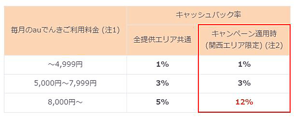 注2:キャンペーンのキャッシュバック率適用は、「auでんき」利用開始から1年間となる。