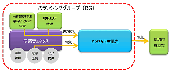 伊藤忠エネクスは、とっとり市民電力が展開する電力事業に対し、今まで培ってきた発電・需給・販売の一貫した機能・ノウハウ及び改正電気事業法対応の新システムを提供し、安定的な電力需給管理・電力供給を実現するためのサポート業務を担う。