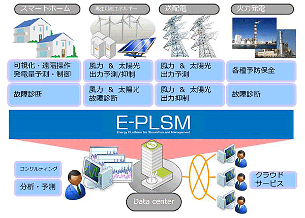 CTCでは、これまでに蓄積したシミュレーション技術を駆使して、再生可能エネルギーのコンサルティングサービスやシステム開発を行ってきている。E-PLSMは、事業者が必要としているエネルギー関連データを集中管理することで、発電施設や蓄電池、その他の設備・機器などを監視して可視化し、発電量や電力需要の予測まで統合的に行うクラウドサービスである。データに基づく傾向と対策を計画し、エネルギーの効率的な利用と最適な運用の実現を支援している。PI Systemの他に、複数拠点とのデータ連携やコスト効率など統合的なクラウドサービスを必要とする顧客にはE-PLSM(図参照)を提供することで、さらなるサービス拡販をおこなっていく。