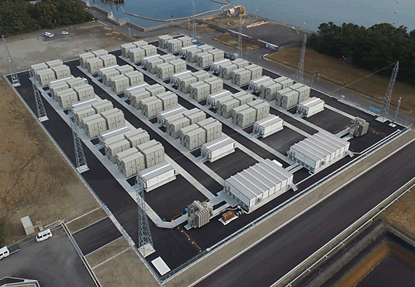 | NAS電池(ナトリウム・硫黄) | 出力5万キロワット・容量30万キロワット時、(約100m×約140m:面積約14,000m2)、コンテナ型252台(200キロワットコンテナ4台×63台)〔日本ガイシ株式会社製〕 |