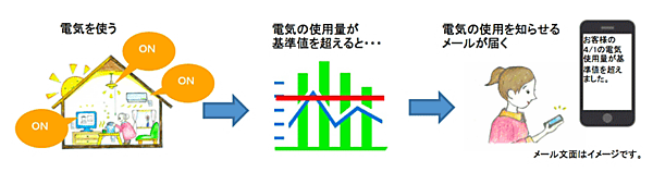 ワタミグループは宅食事業を展開しており、1日に約22万人の顧客に日替わりの弁当を届けている。同サービスである「ワタミの宅食」の利用者を対象※1に、電力購入のセットメニューとして、電力供給先の家庭で電気が使用されたことをメールで知らせるサービス「おはようメール」を導入しする。「おはようメール」は、1日1回、正午までに電気の使用状況を、登録したメールアドレスに自動送信するサービスとなり、離れて住む家族に対し、メールで電力使用を知らせるなど、一人暮らしの高齢者や高齢者世帯の「見守り」効果も強調される。※2(図1参照)