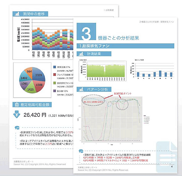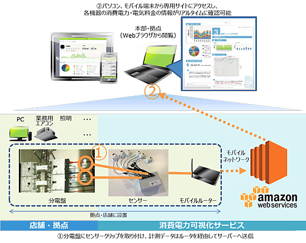 同消費電力可視化サービスは、分電盤の配線ごとにクリップセンサーを取り付け、機器ごとの消費電力データを収集、そのデータを専用のWEBサイトで容易に閲覧することができるサービスとなる。配線ごとにセンサーを取り付けられるため、個々の機器の電力使用量を計測でき、消費する電力をリアルタイムに把握することが可能となる。これらのデータを分析することで、電力消費の抑制に加え、各機器の利用時間帯やオペレーション状況なども把握でき、業務改善も実現できる。(図1参照)