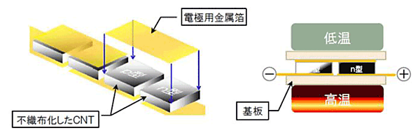 CNT温度差発電シートは、生活環境等の身近な温度領域での発電が可能で、温度差を利用したエネルギーハーベスティングへの利用が期待される。また、CNT温度差発電シートは、鉛、テルル等の毒性物質を全く含まないため、環境親和性の高い発電デバイスといえる。