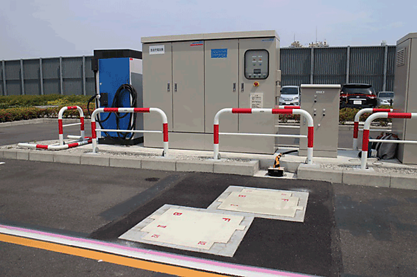 ワイヤレス充電システムは、ケーブルを使用することなく地上の電源装置から車内に搭載された蓄電池に電気を送ることができるシステムである。運転席でのボタン操作のみで充電ができるため、充電時の安全性と利便性を向上させることができる。従来型の電磁誘導方式※2よりも送受電パッド間が離れた状態で送電することができる磁界共鳴方式※3に、さらに東芝独自の充電パッド構成を採用することなどによって、送電パッドと受電パッドが左右20cm、前後10cmまでずれていても充電することが可能となった。(写真2参照)また、放射エミッション値※4の基準を満たしているため、電波を利用する周囲の設備に影響を与えることはない。