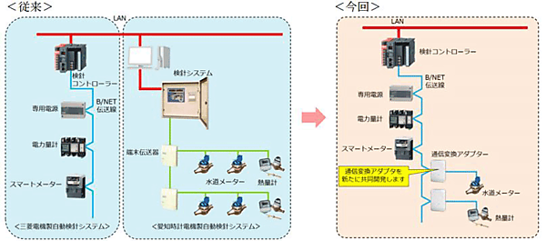 愛知時計電機製の水道メーターおよび熱量計の検針データをB/NET接続するための変換アダプターを共同開発し、三菱電機製電力量計の検針データと併せて、共通の検針コントローラーで一括管理できるシステムの開発を進める。(図参照)