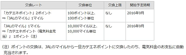 2016年6月16日、中部電力株式会社(以下:中部電力、名古屋市東区、代表取締役社長:勝野 哲)と、日本航空株式会社(以下:JAL、東京都品川区、代表取締役社長:植木 義晴)は、顧客の利便性とサービス向上、相互の企業価値向上を目的とし、中部電力の家庭向けWEBサービス「カテエネ」のポイントサービス(以下:カテエネポイント)と、JALのマイレージサービス「JALマイレージバンク」(以下:JMB)の「マイル」の相互交換を実施することについて、合意したことを発表した。