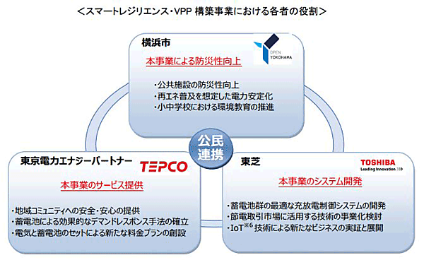 2016年7月6日、横浜市(横浜市長:林 文子)、東京電力エナジーパートナー株式会社(以下:東京電力EP、東京都港区、代表取締役社長:小早川 智明)、株式会社東芝(以下:東芝、東京都港区、代表執行役社長:綱川 智)は、横浜市内における「仮想の発電所」(バーチャルパワープラント:VPP)の構築※1に向けた事業「スマートレジリエンス※2・バーチャルパワープラント(以下:VPP)構築事業」に係わる基本協定を締結したことを発表した。