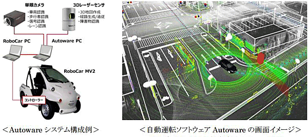 市販1人乗り用小型EV車ベース自動運転技術開発プラットフォームRoboCar MV2に、レーザレーダ、カメラなどの環境センサを搭載、自動運転ソフトウェアとしてAutowareを実装することで、自車位置や周囲物体を認識しながら、カーナビから与えられたルート上を自律走行することが可能となる。(図参照)ZMPは、センサの選定および車両への搭載、Autowareのインストールと車両をスムーズに制御するためのRoboCar MV2のチューニングを行い、テストコースでの走行テストを行った上で自動運転システム実験車両として納品する。併せて要望にあわせて技術サポートサービスを提供、顧客のスムーズな自動運転技術の研究開発を支援する。