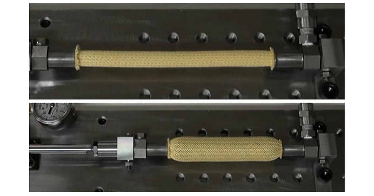 図 今回開発した油圧人工筋肉。油圧をかけると上の写真ように伸び切った状態から、下の写真のように収縮する