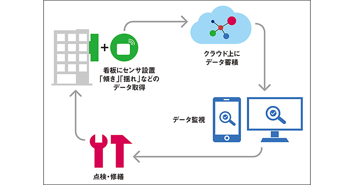 実験では、看板に取り付けたセンサーが検知した「傾き」や「揺れ」などのデータを無線通信でクラウド上のサーバーに送信する。サーバー側ではデータの推移を「看板の状態変化」と捉え、早期メンテナンスの計画立案、実際の点検作業、補修工事に役立てる。無線通信方式については、LPWA(Low Power Wide Area)など複数の方式から最適なものをこの実験を通して見極めるとしている。