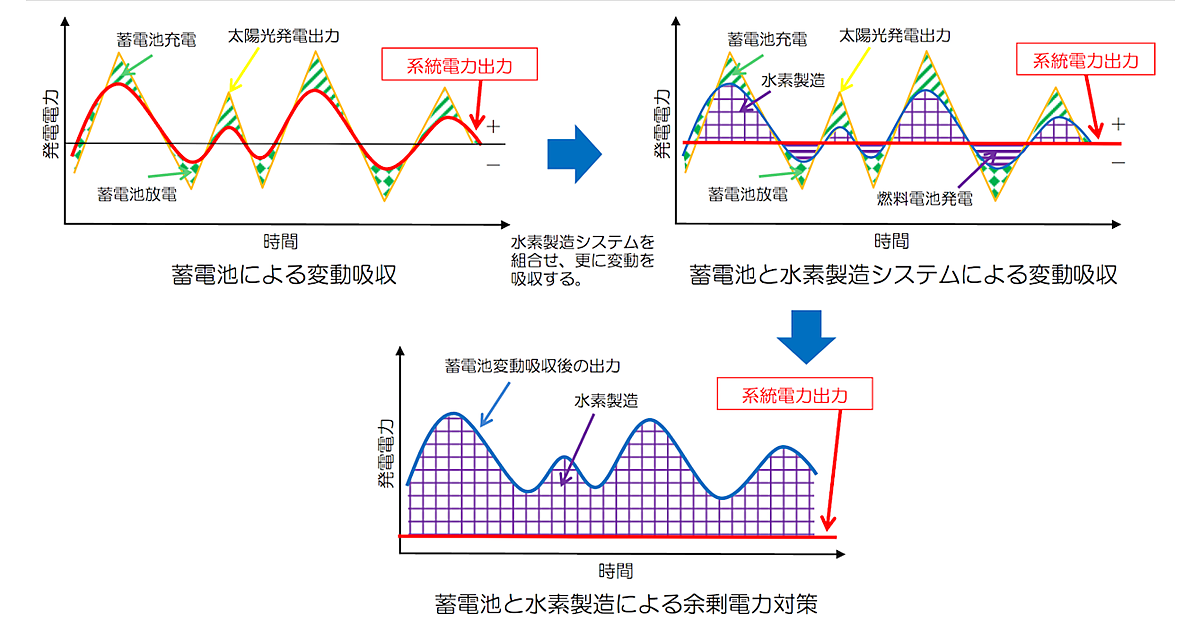 図 短周期変動を蓄電池で、長周期変動を水素製造装置で吸収することを狙う