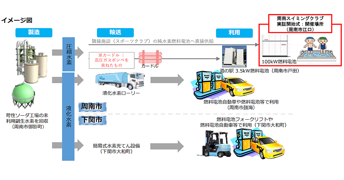 この事業では、苛性ソーダの製造過程で発生する水素を回収、液化、圧縮してボンベに詰め、周南市や下関市の施設で活用する。周南市の「周南スイミングクラブ」には出力100kWの燃料電池を設置済み。この燃料電池で発電した電力と、発電時に発生する熱はスイミングクラブで活用する。