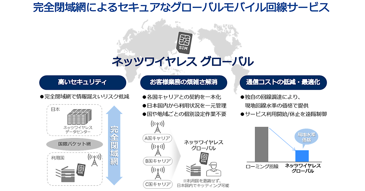 さらに、ローミングを使用せず、現地携帯電話通信事業者の回線を利用するので、現地と同じ水準の価格で通信網を利用できる。インターネットを通す必要のない通信なら、閉域網「ネッツワイヤレス」を利用できるので、機密データの送信にも向く。