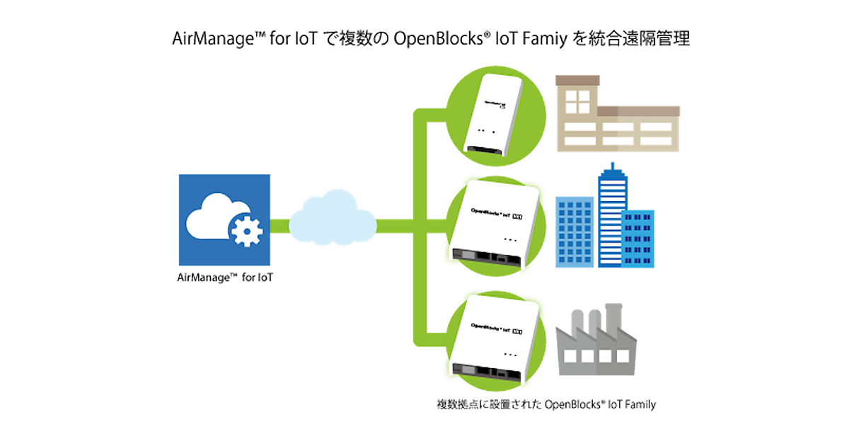 図 AirManage for IoTは、複数の分散配置したOpenBlocks IoTシリーズを一括管理する機能を提供する