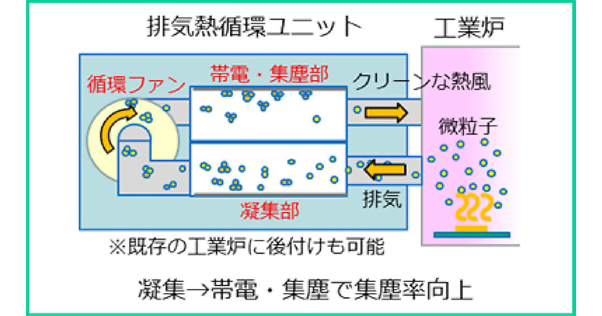パナソニックはNEDOの助成を受けて、捨てるしかなかった排気熱エネルギーを電気などに変換せずに、熱のまま再利用するシステムを開発した。さらにこのシステムに、電界を利用して排気が含んでいる溶媒など不要な微粒子を取り除く機能を加えた。