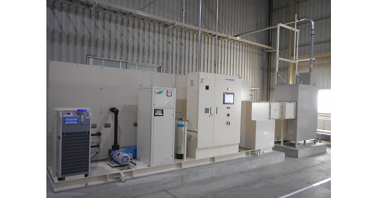 納入したのは日立造船が開発、製造している水素発生装置「ハイドロスプリング」。固体高分子型水電解(Polymer Electrolyte Membrane:PEM)方式を採用したもので、主に太陽光発電設備の電力で動作する。水素生成能力は1時間当たり24Nm3。日立造船はこの装置の設計と製造まで同社の柏工場で済ませ、現地で設置し、試運転まで担当したという。