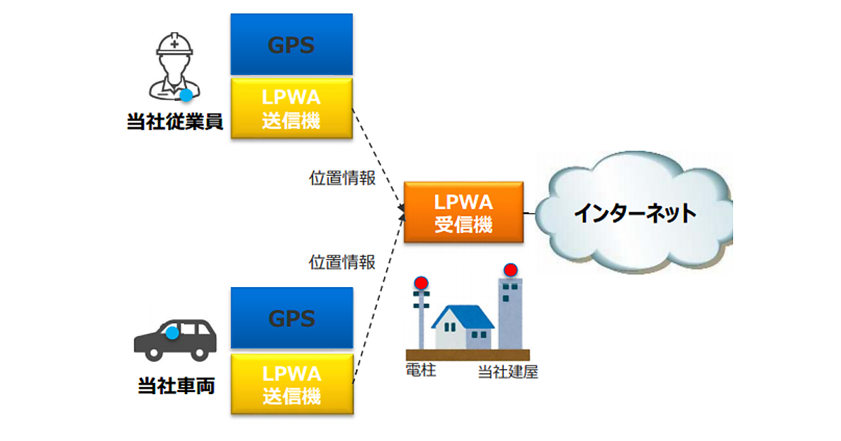 実験では、点検や顧客サービスに回る従業員にGPS(Global Positioning System)機能が付いたLPWA送信機を持たせる。さらに、従業員が巡回に使う車両にもLPWA送信機を搭載する。LPWA送信機が送り出す位置情報を電柱などに取付けた受信機で受信し、中部電力が運営するクラウドに送信、蓄積する。