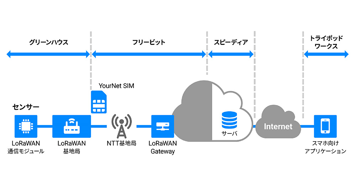 センサー向けのLoRaWAN通信モジュールと、LoRaWAN基地局はグリーンハウスが用意する。基地局からLoRaWANゲートウェイを通って、クラウドまでつながる通信路はフリービットが担当する。スピーディアはクラウド基盤とデータを蓄積する環境、データの推移を表示するプログラムを準備する。トライポッドワークスはスマートフォン向けアプリケーションの開発を担当する。