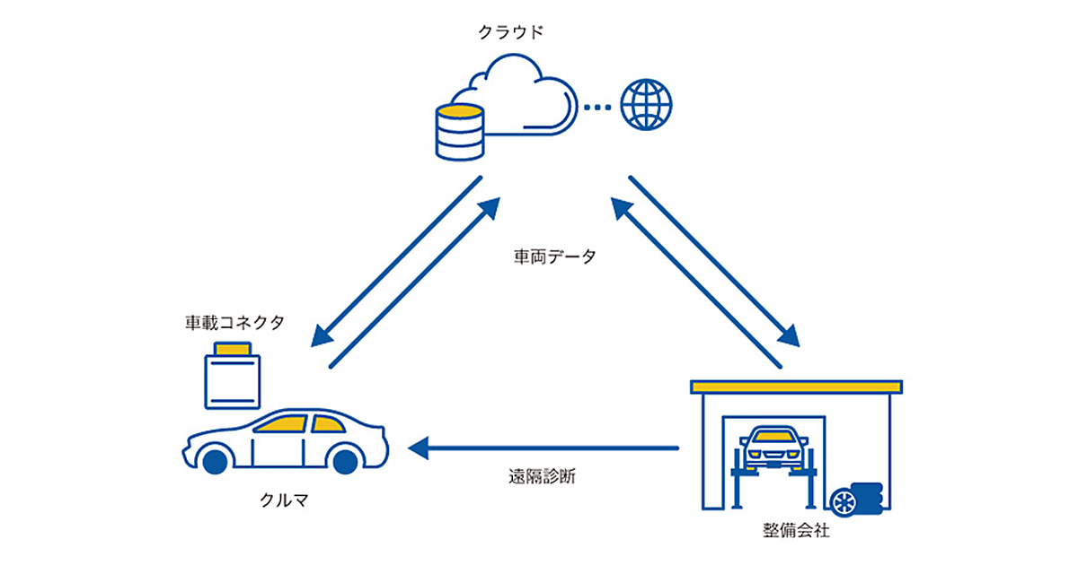 車載コネクタは収集したデータをBluetooth通信で運転者のスマートフォンに転送し、スマートフォンはLTE/3G通信でGMOクラウドが運営するサーバーに送信する。車両コンディションを自動的に解析するシステムと、自動車の状態を遠隔診断するシステムには、自動車整備会社がアクセスし、システムが有効に働くかどうかを検証する。