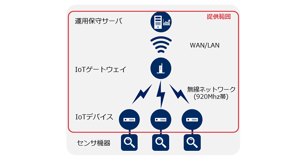 NEC オンデマンド型無線ネットワークを構成する機器は3種類。1つ目はIoTのセンサーを接続して、センサーの検出値を無線通信で送信する通信機「IoTデバイス」。2つ目はIoTデバイスからの無線通信を受信して、無線LANや携帯電話通信網でインターネット上のサーバーにデータを転送する「IoTゲートウェイ」。3つ目は端末を管理する「運用保守サーバー」。