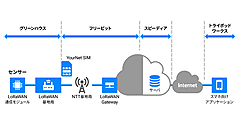 センサーは近くに専用アプリケーションをインストールしたスマートフォンの存在を検知すると、そのスマートフォンに蓄積したデータをBLEで送信する。スマートフォンの専用アプリケーションは、受信したデータを携帯電話通信網や無線LANを使ってクラウドのサーバーに送信する。