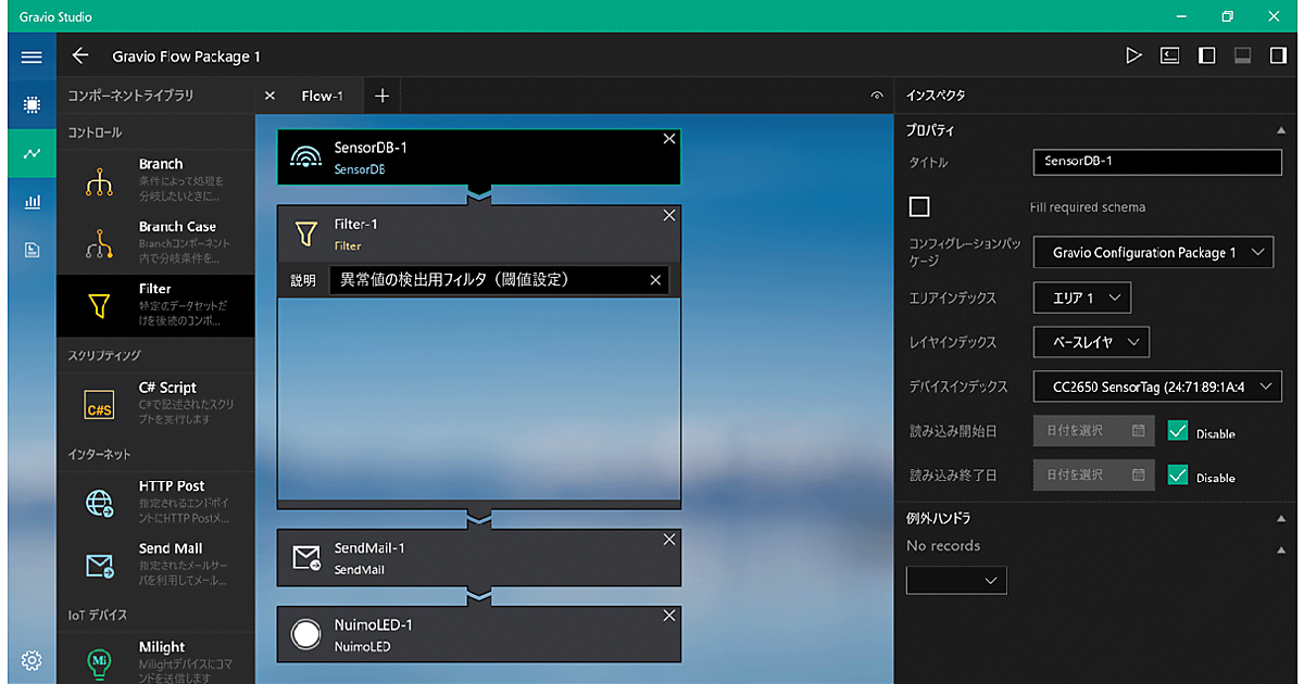 図 Gravioで、センサー機器からのデータを処理する流れを設定しているところ