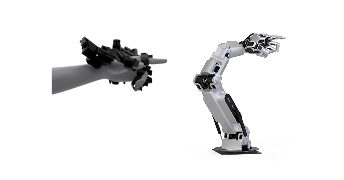 図 イクシーの「EXOS」。ロボットアームが検知した触覚をグローブを通して人間に伝える