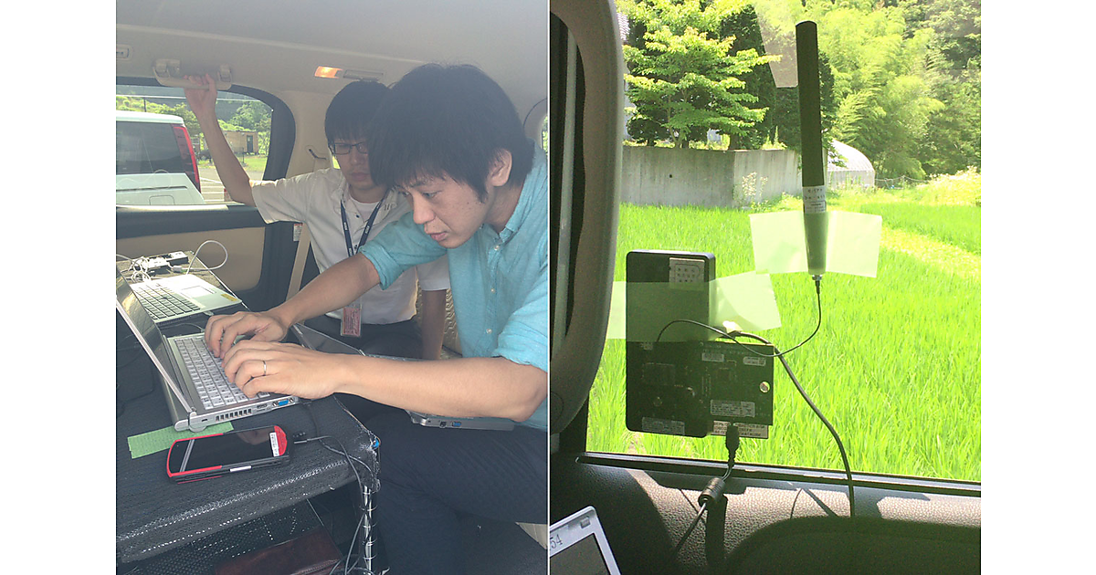 図 実験の作業に取り組む技術者(左)。技術者が乗る車両の窓には簡易的なアンテナが貼り付けてある(右)