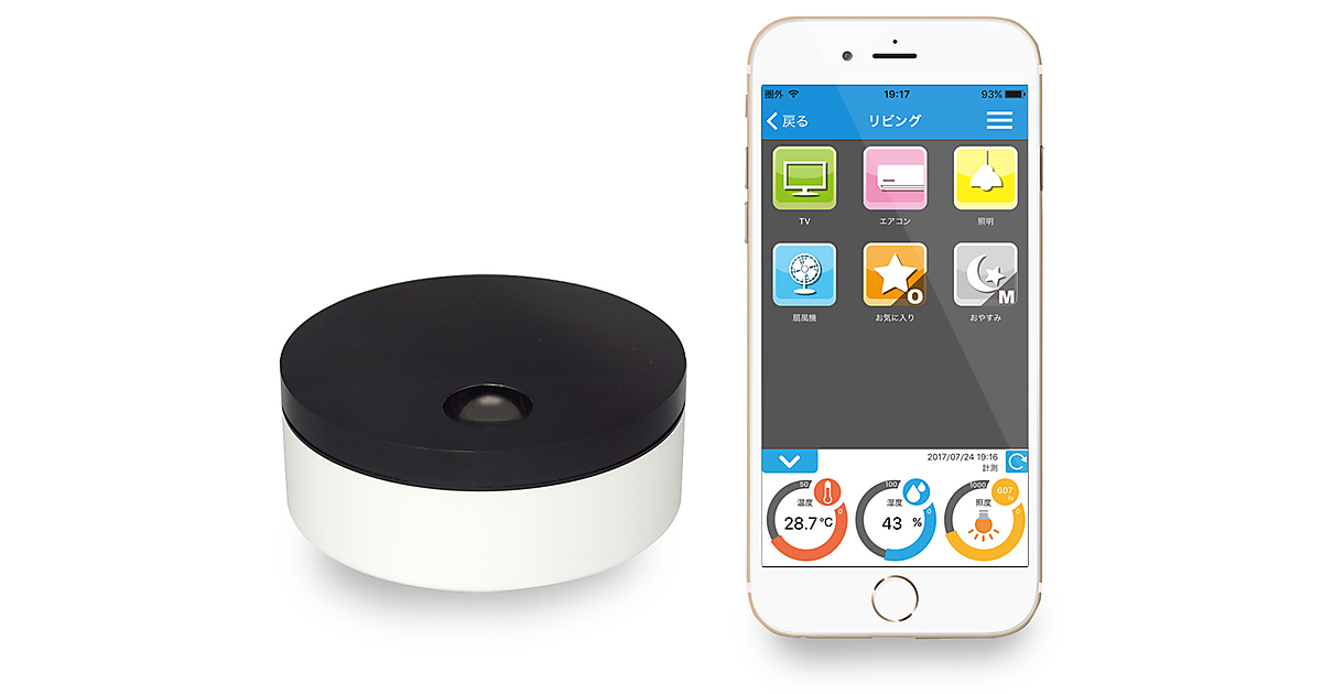操作にはスマートフォン向けの専用アプリケーションを利用する。学習リモコンは無線LAN通信機能を備えており、無線LANルーターを経由してスマートフォンと通信できるようになっている。専用アプリケーションで、タップやフリックなどの簡単な操作をすると、学習リモコンが該当する家電に赤外線の信号を送って制御する。また、専用アプリケーションは、学習リモコンが内蔵する温度、湿度、照度センサーの計測値を表示する機能も持つ。この計測値から室内環境を推定して、家電製品を稼働させるということも可能だ。