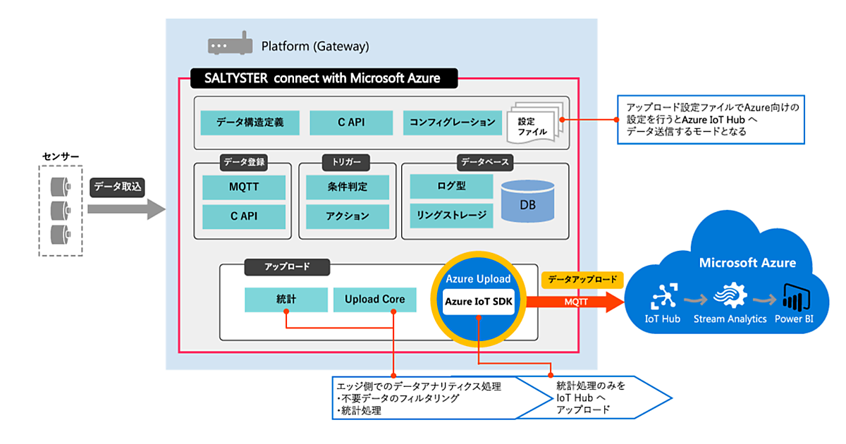 ソルティスターは2017年8月21日、IoTゲートウェイに組み込むことで、エッジコンピューティングの機能を持たせることを可能にするソフトウェア「SALTYSTER connect with Microsoft Azure」の提供を開始した。Microsoft Azureの「Azure IoT Hub」に簡単に接続できる点が特徴。Azureとの接続部分をスクラッチで開発する必要がなくなるので、開発期間を短縮できる。