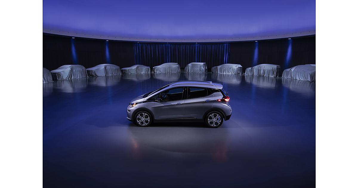 図 2016年12月に発売したEV「Chevrolet Bolt EV」。奥には幕がかかった自動車が並んでいる。今後続々登場するEVの新車種をイメージしていると考えられる