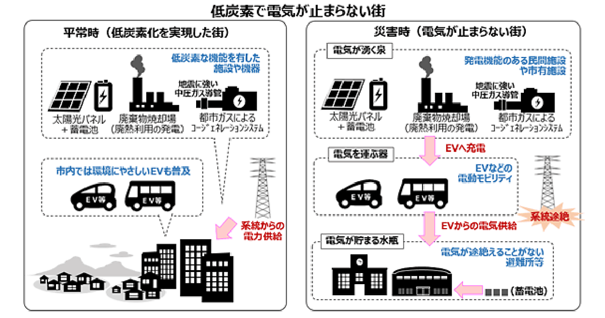 東京電力エナジーパートナーは、EVの電力を避難所などの施設に供給する「V2Xシステム」とその関連サービスを開発する。また、災害時の電力供給体制を検討し構築する。民間施設や市有施設が準備している事業継続計画(BCP:Business Continuity Plan)の診断と、その結果に応じた施設整備の提案も担当する。