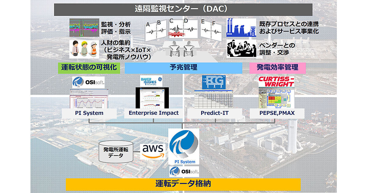 両社はサービス提供を視野に入れて2015年から東京電力の火力発電所で各種技術と分析システムの効果を検証してきた。そして、2017年1月からは東京電力フュエル&パワーの社内に遠隔監視センターを設置して、試験運用を始めた。ここでは、クラウド基盤としてAmazon Web Servicesを利用し、データの蓄積、分析の基盤としてアメリカOSIsoftの「PI System」を、設備の監視と故障時期予測などの予兆管理にアメリカGeneral Electricの「Enterprise Impact」と、アメリカEngineering Consultants Groupの「Predict-IT」、熱効率の管理と改善にアメリカCurtiss-Wrightの「PEPSE」と「PMAX」を利用した。