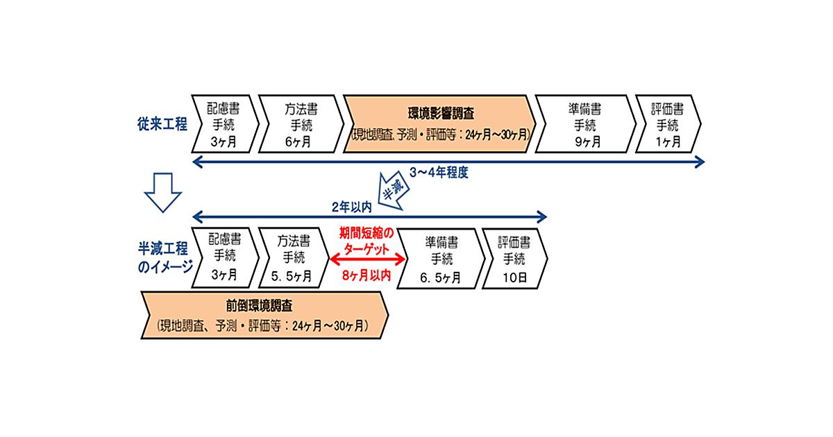 これまで、風力発電施設や地熱発電施設の建設前に実施する環境アセスメントは、「配慮書手続」「方法書手続」「環境影響評価」「準備書手続」「評価書手続」の各手順を順番に実施していた。NEDOが今回公開したガイドブックでは、「配慮書手続」「方法書手続」に先立って「環境影響評価」を開始し、書類手続きを並行して進めるというものだ。NEDOは、従来の手順で環境アセスメントを進めると、完了までに3~4年かかるが、今回提案する手法を利用すれば、その期間をだいたい半分まで短縮できるとしている。