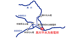 黒川と小黒川の上流にそれぞれ「えん堤」を作り、えん堤の手前から導水路を引いて発電所まで流す。えん堤を超える水流を下流に流し、えん堤で止まった水流を利用するわけだ。導水路は上図のように山地にトンネルを通して川の流れとは別のルートで作る。
