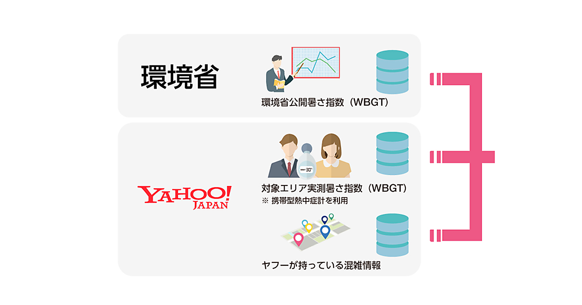 今回の実証実験では、環境省の公開データに加えて、ヤフーが保持する精細な位置情報データと、分析対象地区の混雑情報を利用する。熱中症リスク予測モデルをヤフーが作成し、このモデルで各種データを分析し、約125m四方のエリアごとの熱中症リスクを予測する。