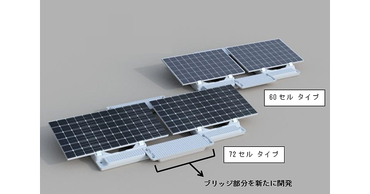三井住友建設は2018年8月8日、水上太陽光発電所用フロート架台「PuKaTTo」に大型発電モジュールに対応する製品を追加すると発表した。従来品は60の太陽光発電セルを内蔵するモジュールに対応するが、新型は72セルに対応する。水上に浮いて太陽光発電モジュールを支える「フロート」はそのままに、隣接するフロートを連結する「ブリッジ」を大きくすることで72セルモジュールに対応した。