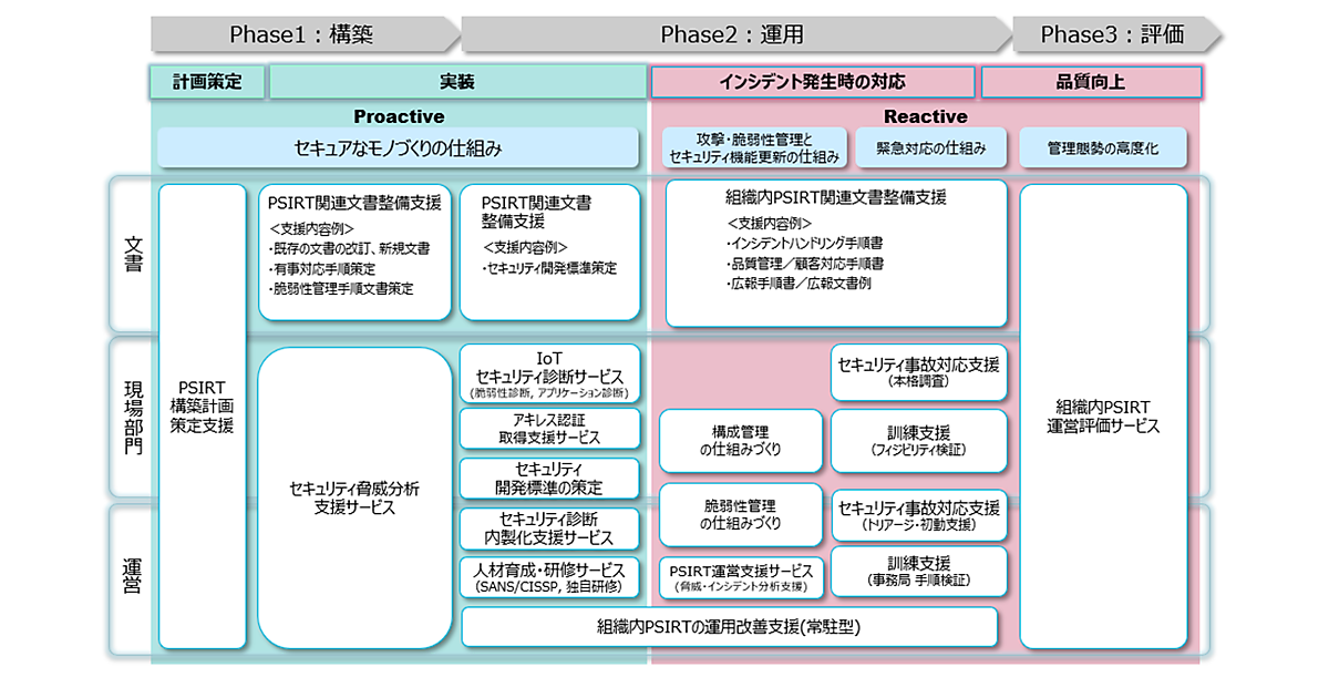 IoT機器が関連するインシデントを防止するには、発売前に製品が攻撃の標的となるような脆弱性を抱え込まないように、設計や製造の段階で管理体制、安全な製造プロセス、製造時に守らなければならないルールを整備するなどの作業が必要だ。NRIセキュアテクノロジーズのPSIRT支援サービスでは、PSIRTという組織を立ち上げる際に支援するだけでなく、PSIRTが製品の設計、製造段階で果たす役割を明確にし、その役割を果たせるように支援する。