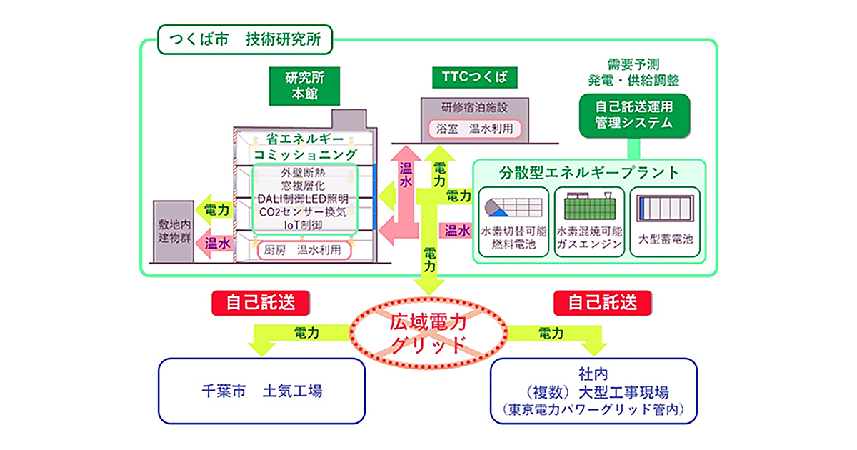 さらに発電した電力は、電力の自己託送制度を利用して電力会社の送電網を通して、遠隔地にある事業拠点や大型工事現場などに送電する。そして、電力供給を受ける拠点では、外壁団別処理やLED照明制御などを活用して需要を最小化する。将来はAI(人工知能)を活用して電力需要量を予測したり、各種センサーと空調機器、照明機器を連携させることで、さらに需要を削減するとしている。
