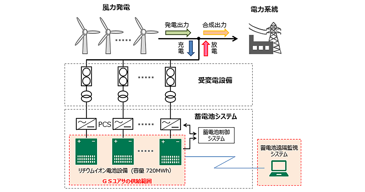 図 建設を予定している蓄電システムの構成。風力発電所が発電した電力を一時吸収する