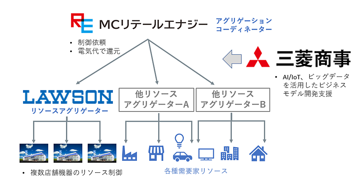 この事業では、ローソンが複数の店舗群の電気機器を統合管理、制御する「リソースアグリゲーター」となり、MCリテールエナジーは複数のリソースアグリゲーターを管理し、電力を受けるアグリケーションコーディネーターの役割を果たす。三菱商事はAIやIoT(Internet of Things:モノのインターネット)技術を活用したシステム開発と事業開発を支援する。
