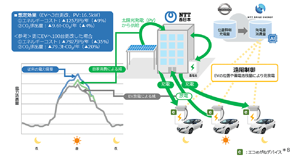 西日本電信電話(NTT西日本)、NTTスマイルエナジー、日産自動車の3社は、太陽光発電システムと電気自動車(EV)を組み合わせてエネルギーコスト削減効果とCO2排出量削減効果を検証する実験を実施すると発表した。