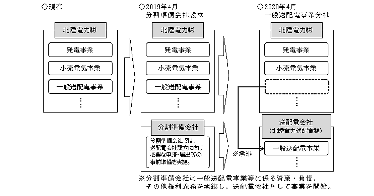 北陸電力が発表した基本計画では、2019年4月に分割準備会社を設立し、北陸電力と分割準備会社の間で吸収分割契約を締結する予定となっている。そしてこの会社は送配電を担当する会社の新設に必要な各種申請や届け出などの事前準備を進める。