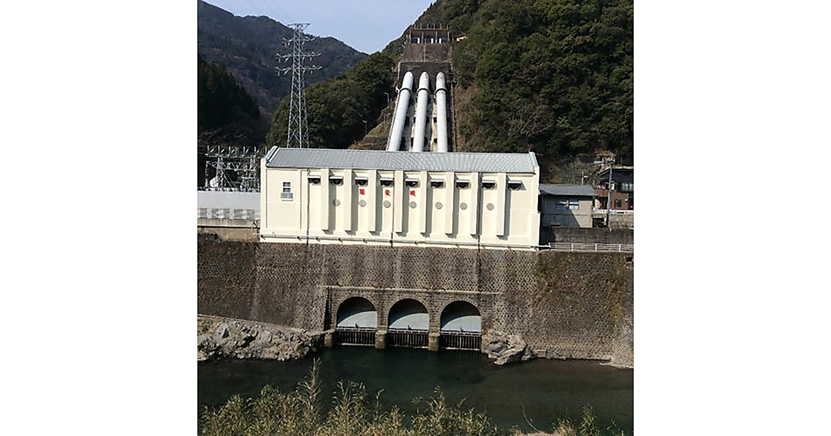 五ヶ瀬川発電所の所在地は宮崎県西臼杵郡(にしうすきぐん)の五ヶ瀬川流域。上流の取水口から発電に必要な水を取り込み、導水管を通して運び、落差を付けて発電所に流し込んで発電用水車を回す「流れ込み式」の発電所だ。水車には最大で1秒当たり29.7m3の水が流れる。