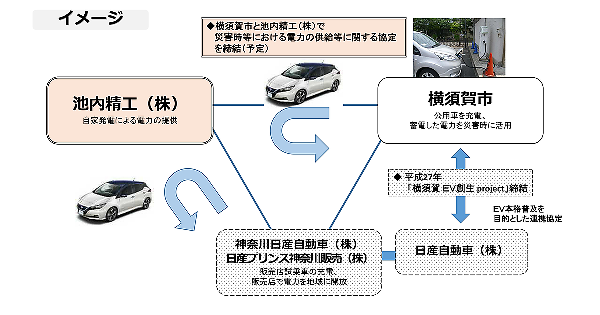 日産自動車と横須賀市、および横須賀市の金属加工業者である池内精工は、「災害時等における電力の供給等に関する協定」を締結した。
