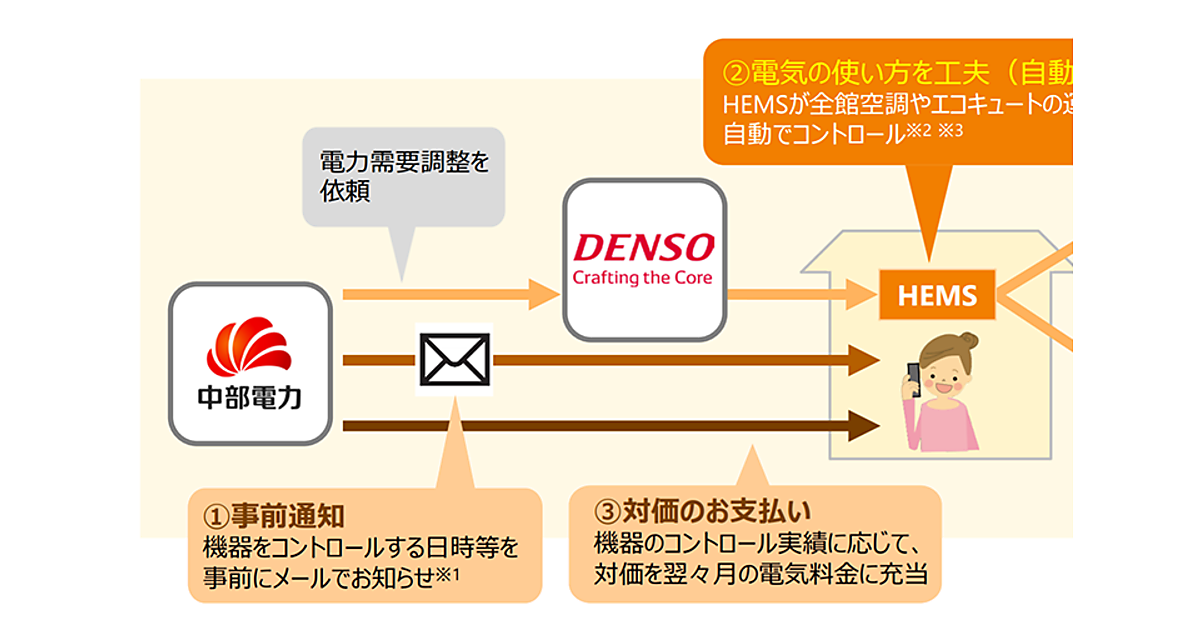 中部電力とデンソーは、一般世帯向けデマンドレスポンスサービス「CO(コ)-エネ」の提供を2019年2月1日から始めると発表した。
