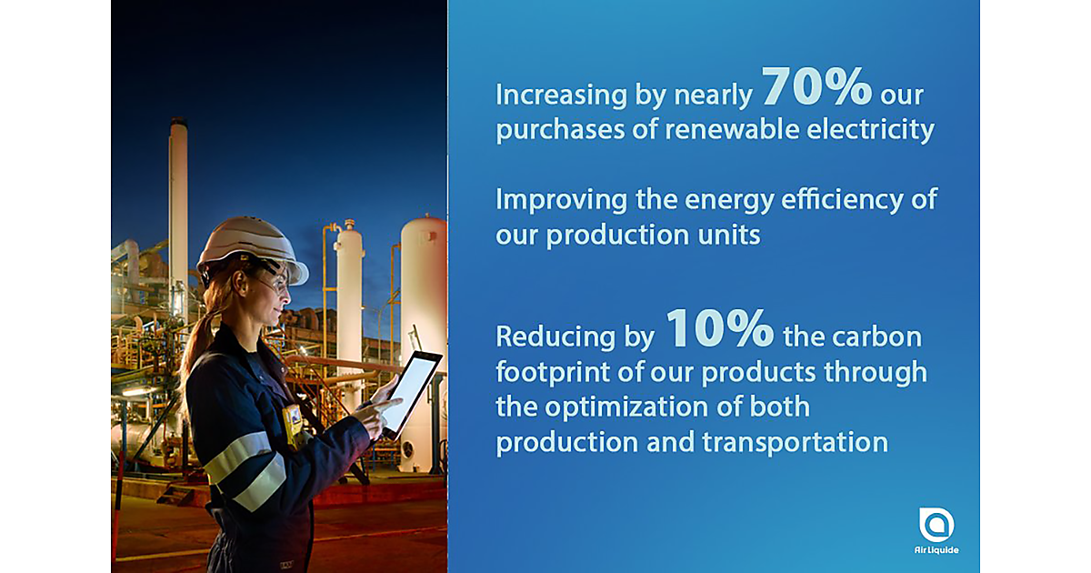 Air LiquideはCO2排出量を削減するために、今後は再生可能エネルギー由来の電力の買取り量を70%ほど増やす。さらに、各種ガス製造装置のエネルギー効率を向上させる。加えて、ガス製造と輸送の業務工程を見直して最適なものに作り替え、個々の製品に関係するCO2排出量を10%ほど削減させるとしている。