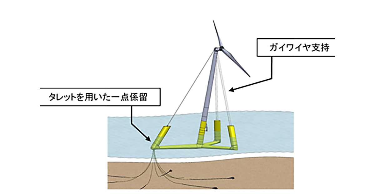 NEDOは2016年12月から2017年度まで、浮体式洋上風力発電設備の低コスト化を実現するための要素技術の開発に取り組んでいる(参考記事)。その結果として生まれた、浮体と風車支柱頂点をワイヤで繋いて強度と剛性を確保し、浮体と支柱を軽量化する「ガイワイヤ支持技術」や、浮体と係留ワイヤーがつながる部分に巨大なベアリングで構成した回転機構(タレット)を組み込み、浮体と発電設備が自由に回転できるようにする「タレットを用いた一点係留技術」などの先端技術を活用して、発電設備のコスト、発電コストの低減を目指すとしている。