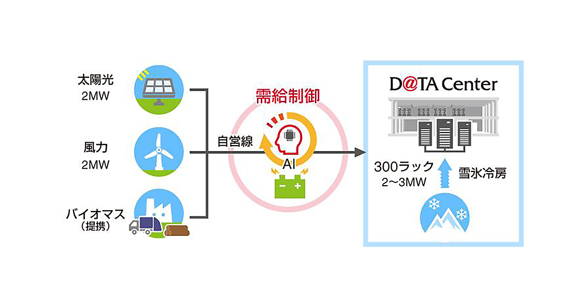 電力は太陽光発電所、風力発電所、バイオマス発電所から供給を受ける。また、降雪量が多い地域に立地することを活かして、冬季に降った雪を蓄積し、夏期にはサーバーの冷却に活用する雪氷冷房設備を設置し、冷房に必要な電力量を大きく削減するとしている。
