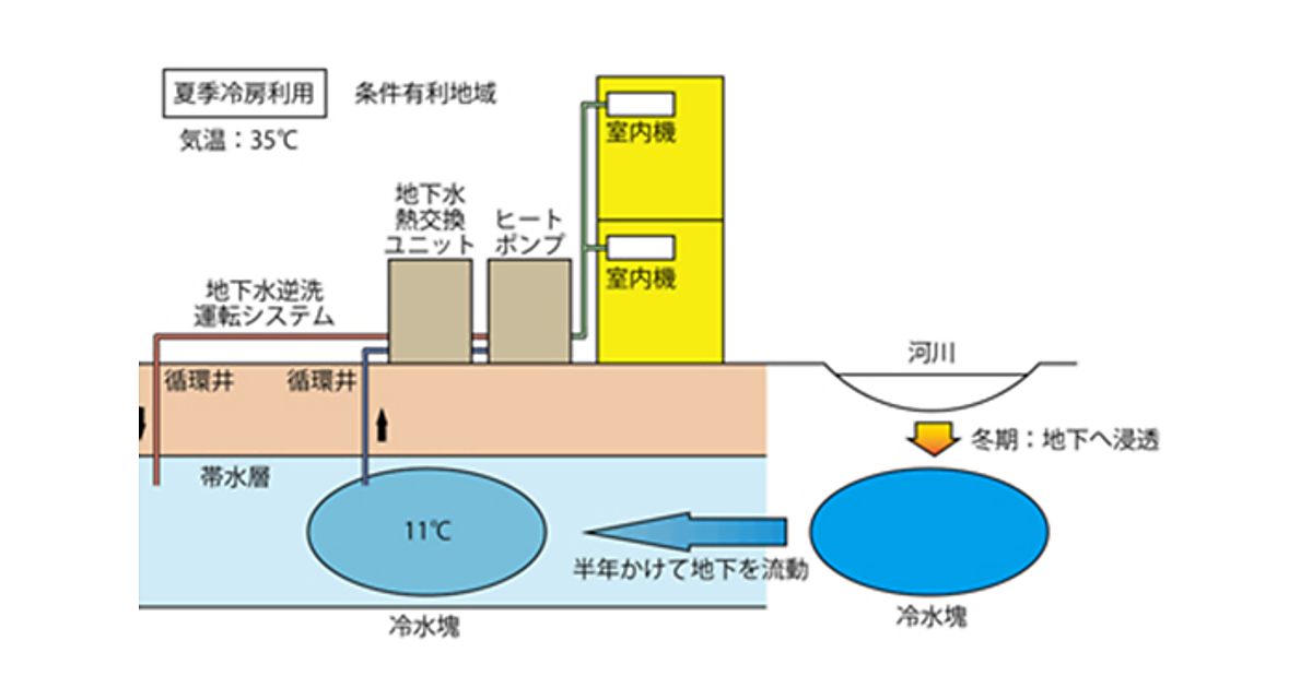 今回の実証運転の場となった長良川扇状地は、ほかの地域に比べて地中熱利用に有利な条件が揃っている。この地域では、冬季に冷えた河川水が地下の「帯水層」に浸透し、半年ほどの間に冷たい河川水が帯水層で流動し、移動する。つまり、冬季の冷えた河川水を夏期の冷房に利用できるわけだ。反対に、夏期は温かい河川水が帯水層に浸透し、半年ほどの間に帯水層で流動、移動する。こうして、夏期の温かい河川水を冬季の暖房に利用できる。